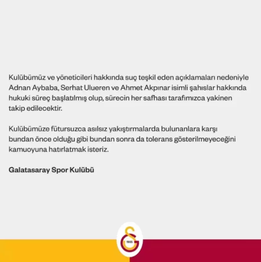 Galatasaray Spor Kulübü, Adnan Aybaba, Serhat Ulueren ve eski Beşiktaşlı yönetici Ahmet Akpınar'a karşı sert bir adım attı. Sarı kırmızılı kulüp, söz konusu isimlerin yapmış olduğu açıklamaların ardından suç duyurusunda bulundu. Kulüpten yapılan resmi açıklamada, "Kulübümüze fütursuzca asılsız yakıştırmalarda bulunanlara karşı bundan önce olduğu gibi bundan sonra da tolerans gösterilmeyeceğini kamuoyuna hatırlatmak isteriz" ifadelerine yer verildi.