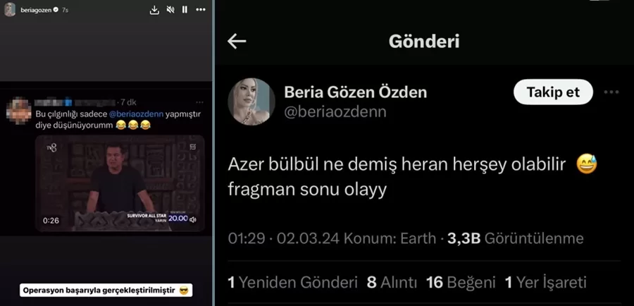 https://youtu.be/txtjizu2s2ATV8'in reyting rekortmeni yarışması Survivor All Star, bu akşamki bölümüyle izleyicileri ekran başına kilitleyecek. Yapımcı ve sunucu Acun Ilıcalı'nın konseyde açıkladığı, bir yarışmacı yakınının Dominik'e sıra dışı bir ulaşım girişiminde bulunması, izleyiciler arasında büyük bir merak uyandırdı. "Bu olayı daha önce hiç yaşamadık" diyen Ilıcalı, yaşananları "operasyon" olarak nitelendirdi.Dominik'teki gelişmelerle ilgili en çarpıcı yorum ise Kırmızı takım yarışmacılarından Yunus Emre'nin eşi Beria Gözden Özden'den geldi. Sosyal medya üzerinden yaptığı paylaşımlarla, Ilıcalı'nın açıklamalarına esprili bir şekilde atıfta bulunan Özden, "Operasyon başarıyla gerçekleşmiştir" ifadesini kullandı. Ardından "Her an her şey olabilir" diyerek, izleyicilerin merakını daha da artırdı.