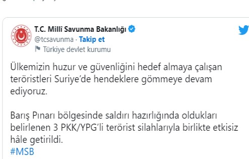 Milli Savunma Bakanlığı sosyal medya hesabından," Ülkemizin huzur ve güvenliğini hedef almaya çalışan teröristleri Suriye'de hendeklere gömmeye devam ediyoruz. Barış Pınarı bölgesinde saldırı hazırlığında oldukları belirlenen 3 PKK/YPG'li terörist silahlarıyla birlikte etkisiz hâle getirildi" paylaşımında bulundu.