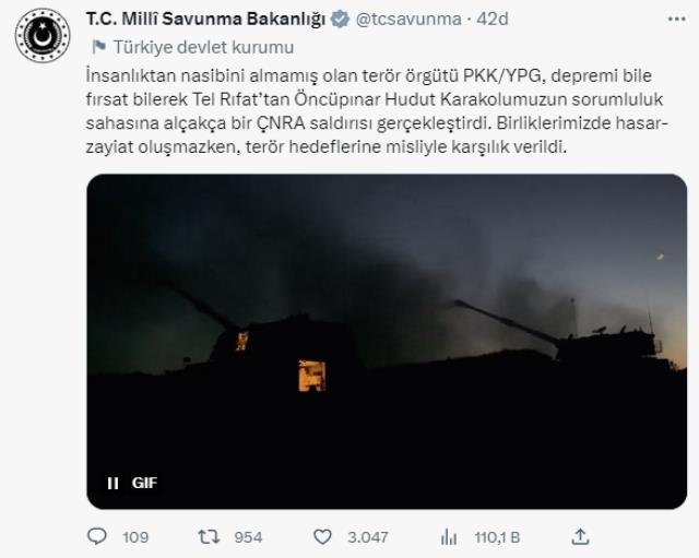 Milli Savunma Bakanlığı'ndan yapılan açıklamada, "İnsanlıktan nasibini almamış olan terör örgütü PKK/ Ypg, depremi bile fırsat bilerek Tel Rıfat'tan Öncüpınar Hudut Karakolumuzun sorumluluk sahasına alçakça bir ÇNRA saldırısı gerçekleştirdi" ifadeleri yer aldı.