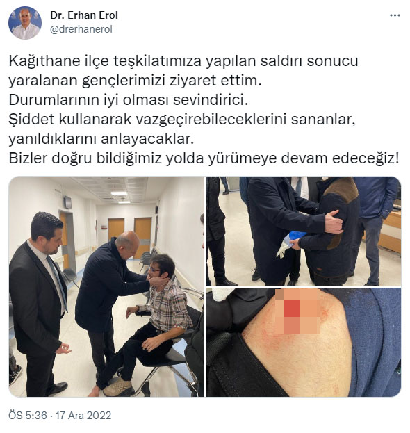 “Kağıthane ilçe teşkilatımız esnaf ziyareti yaptığı sırada, motorlu bir şahıs tarafından teşkilatımıza bir saldırı gerçekleşmiştir. Önce yumrukla ardından da bıçakla saldıran şahıs, gençlik teşkilatımızdan Talha Şahbaz ve Hasan Ünver’in yaralanmasına sebep olmuştur.
