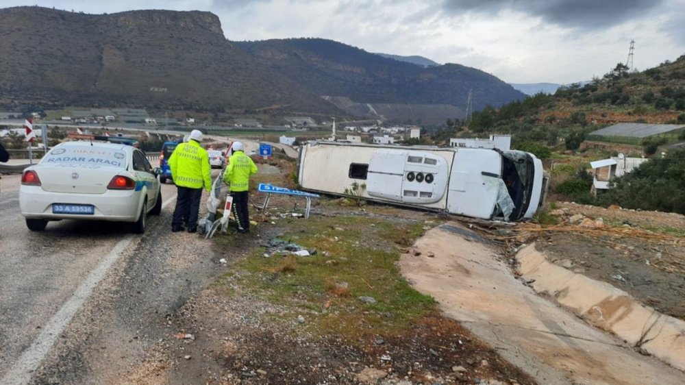 Alınan bilgiye göre, ilçeye bağlı Sipahili Mahallesi'nden aldığı işçileri Akkuyu Güç Santraline götüren Murat Çakmak yönetimindeki 07 ERL 29 plakalı otobüs, direksiyon hakimiyetinin kaybolması sonucu bariyerlere çarparak şarampole devrildi.