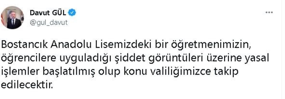 Vali Gül, “Bostancık Anadolu Lisemizdeki bir öğretmenimizin öğrencilere uyguladığı şiddet görüntüleri üzerine yasal işlemler başlatılmış olup, konu valiliğimizce takip edilecektir” ifadelerini kullandı.