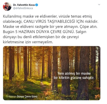 Sağlık Bakanı Fahrettin Koca'nın maske paylaşımı şöyle: