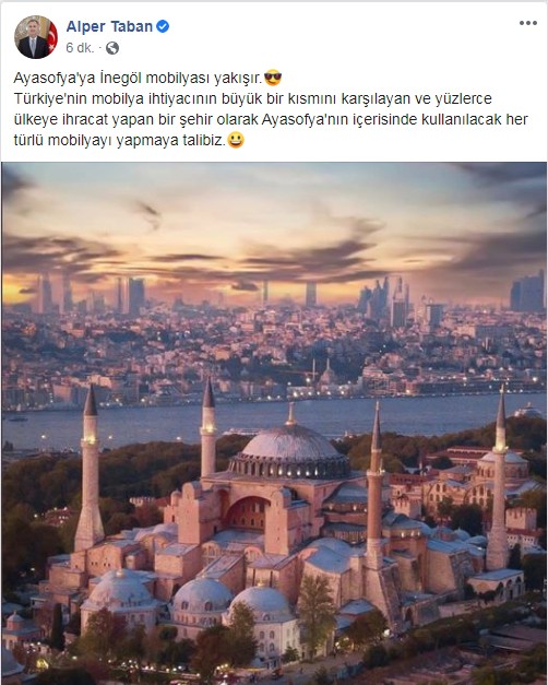 Türkiye'nin mobilya başkenti İnegöl ilçesinin Belediye Başkanı Alper Taban, "Dün tarihî bir gün yaşadık. Ayasofya'nın müzeden camiye dönüştürmesi bizleri çok mutlu etti. Bu mutluluğa bizleri ulaştıran Cumhurbaşkanımıza teşekkürlerimizi iletiyoruz. Kararın ardından dün biz de bazı paylaşımlarda bulunduk. Özellikle bu mutluluğa ortak olabilmek için Aysofya'nın içerisinde yer alan ağaç ahşap dekorasyonla alakalı mobilya işlerine talip olduğumuzu ilettik. Bunlar neler olabilir? Mihrabından minberine ve müezzin mahfillerine kadar her türlü ağaç ve dekorasyon işlerine talip olduğumuzu ve bundan büyük mutluluk duyacağımızı söylemek istiyorum. Gündem daha çok sıcak, bununla ilgili talebimizi gereken yerlere ileteceğiz, ama önce sosyal medyadan sayın Cumhurbaşkanımıza iletmek istedik" dedi.