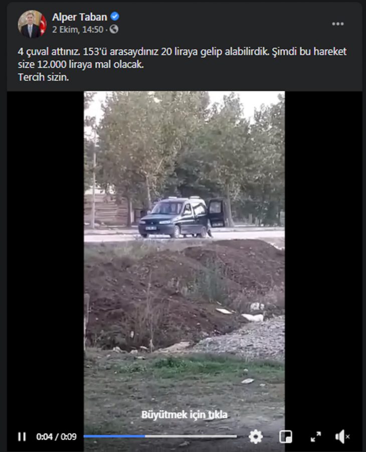 Başkan Taban ise kaçak moloz döken kişiye sosyal medyadan paylaşım yaparak, tepki gösterdi. Başkan Taban yaptığı paylaşımda, 4 çuval attınız. 153'ü arasaydınız 20 TL'ye gelip alabilirdik. Şimdi bu hareket size 12.000 TL'ye mal olacak. Tercih sizin" dedi.
