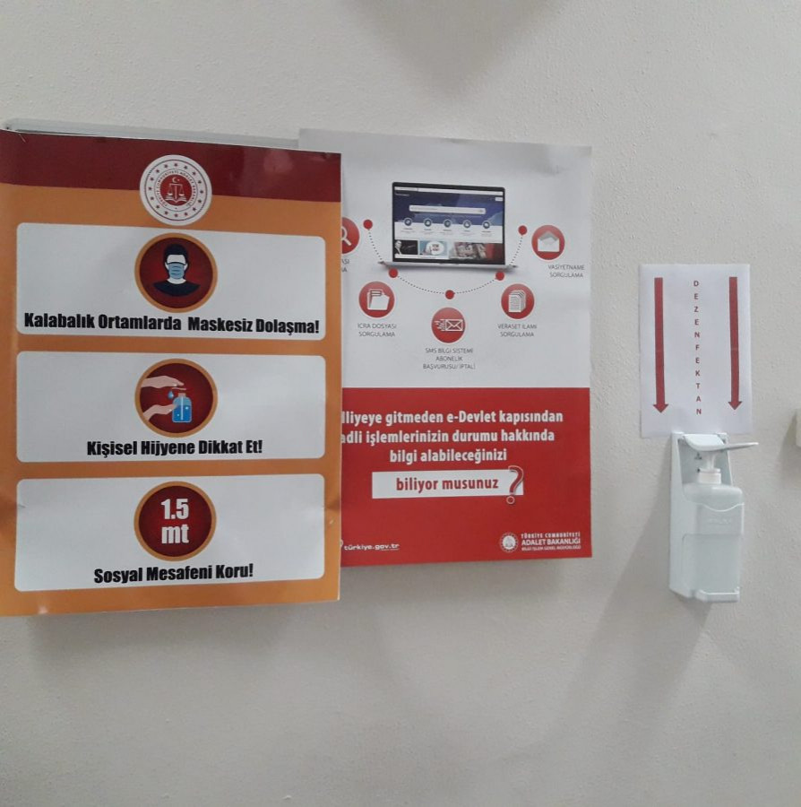 Hakim Savcılar Kurulu (HSK), adli ve idari yargı ilk derece mahkemelerinde duruşma ve keşiflerin 16 Haziran'da başlamasına karar verdi. Bursa Adliyesi'ne de gelecek olan vatandaşların sosyal mesafe uygulamaları için merdivenlerde işaretlemeler görevlilerce yapıldı.