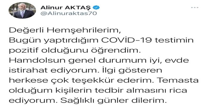 Başkan Aktaş, haberi "Değerli Hemşehrilerim, bugün yaptırdığım Covid-19 testimin pozitif olduğunu öğrendim. Hamdolsun genel durumum iyi, evde istirahat ediyorum. İlgi gösteren herkese çok teşekkür ederim. Temasta olduğum kişilerin tedbir almasını rica ediyorum. Sağlıklı günler dilerim" sözleriyle sosyal medya hesabından duyurdu.