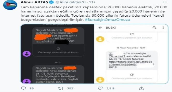 Büyükşehir Belediye Başkanı Alinur Aktaş, sosyal medya hesabından, vatandaşların telefonlarına gönderilen 'Faturanız salgınla mücadele kampanyası kapsamında Bursa Büyükşehir Belediyesi tarafından ödenmiştir' yazılı mesajı paylaştı.