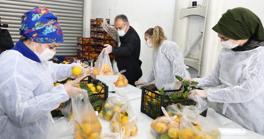 Dünyayı etkisi altına alan 'Covid 19' salgınıyla mücadele kapsamında Türkiye'de ilk vakanın görüldüğü 11 Mart'tan itibaren adeta alarm durumuna geçen, Alo 153, Beyaz Masa ve Büyükşehir Santralini vatandaşların çağrılarına açıp, evden çıkma kısıtlaması bulunan vatandaşların market alışverişlerinden, sıcak yemek dağıtımlarına, gıda ve hijyen kolilerinden Pazar filelerine kadar her alanda destek olan Bursa Büyükşehir Belediyesi, pandeminin pik yaptığı bu günlerde de sosyal destek çalışmalarına hız verdi. Bir taraftan gerek toplu taşıma araçları gerekse de hastaneler ve halkın yoğun olduğu bölgelerde dezenfekte çalışmalarına ağırlık veren Büyükşehir Belediyesi, diğer taraftan evlerinde karantinada bulunan vatandaşların bağışıklık sistemlerini güçlendirmeye yardımcı olmak amacıyla C vitamini destek paketleri devreye aldı. Büyükşehir Belediyesi Sosyal Hizmet Dairesi Başkanlığı'nın kontrolünde, TARIM A.Ş ve BURFAŞ'ın da destekleriyle hayata geçirilen proje kapsamında Hikmet Şahin Kent Hali bu organizasyon için üs olarak belirlenirken, TARIM A.Ş. personelleri tarafından C vitamini bakımından zengin turşu, limon, portakal, mandalina ve narlar özenle seçilip, bez poşetlere dolduruluyor. Hazırlanan C vitamini destek paketleri, talepte bulunan vatandaşların evlerine kadar götürülüyor.