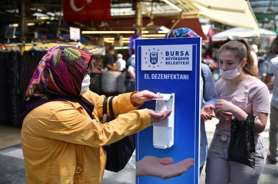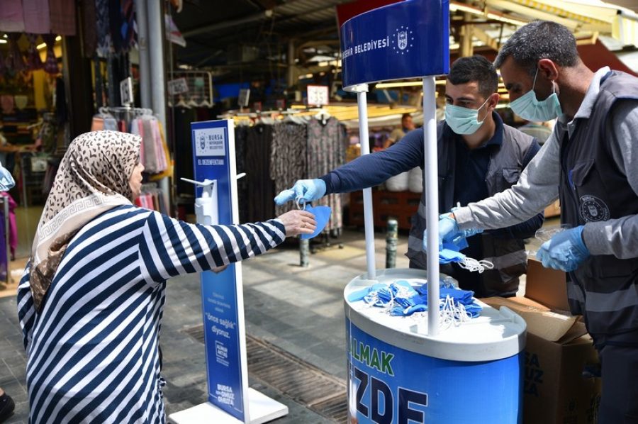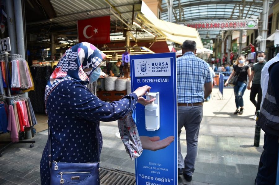 Yine çarşının 6 farklı bölgesinde, Bursalılar için dezenfeksiyon üniteleri kuruldu. Ünite başına gelen Bursalılar, ellerini dezenfekte ederek, salgına karşı daha güvenli hale geldi.