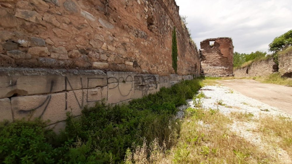 Bursa'nın İznik ilçesinde bulunan Roma dönemine ait 2 bin yıllık surlar sprey boya ile karalandı, surların yanında ateş yakılması sebebiyle kara lekeler oluştu.