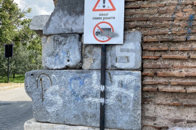 Bursa'da 2 bin yıllık surlara gamalı haç çizdiler