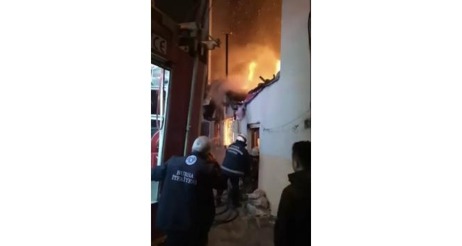 Bursa'da ahşap binada çıkan yangında alevler geceyi aydınlatırken itfaiye ekipleri yangını söndürmek için yoğun çaba sarf etti.