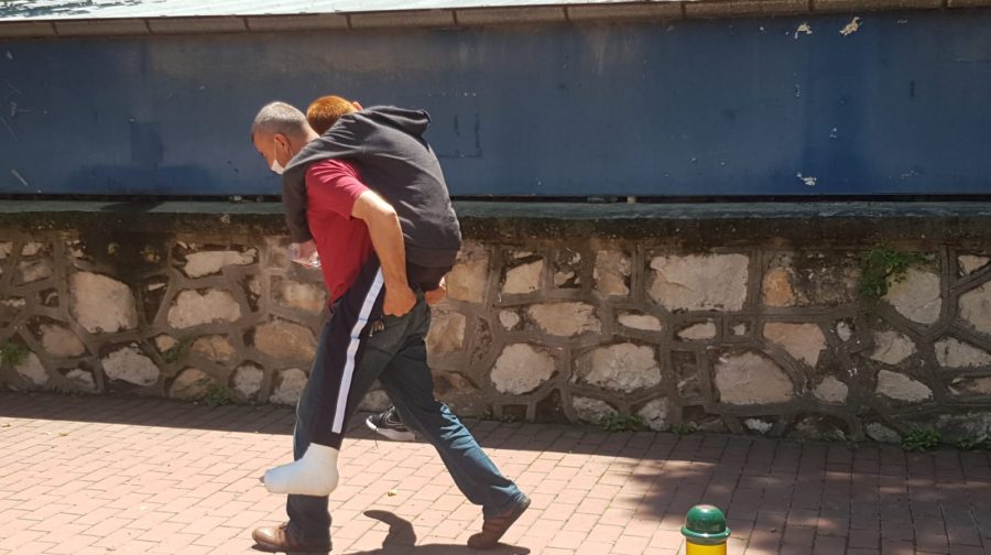 Bursa'da bacağı alçılı oğlunu, sınava sırtında taşıyarak getirdi