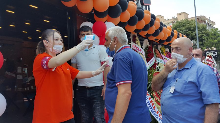 Daha önce salgın nedeniyle ertelenen iş yerinin açılışında koronavirüse karşı sıkı tedbir alındı.