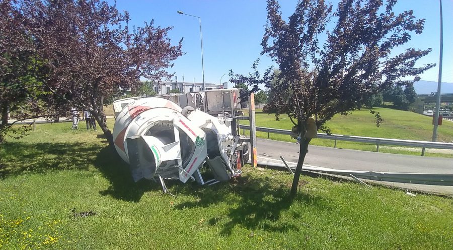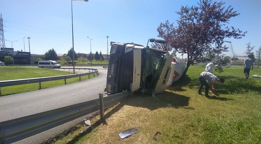 Edinilen bilgiye göre 16 YC 058 plakalı beton yüklü kamyonun sürücüsü viraja gireceği sırada bariyerlere çarparak yan yattı.