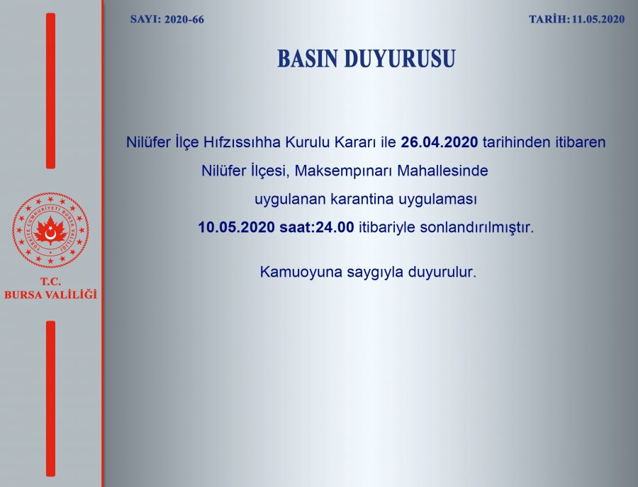 "Nilüfer İlçe Hıfzıssıhha Kurulu Kararı ile 26.04.2020 tarihinden itibaren Nilüfer İlçesi, Maksempınarı Mahallesinde uygulanan karantina uygulaması 10.05.2020 saat:24.00 itibariyle sonlandırılmıştır."