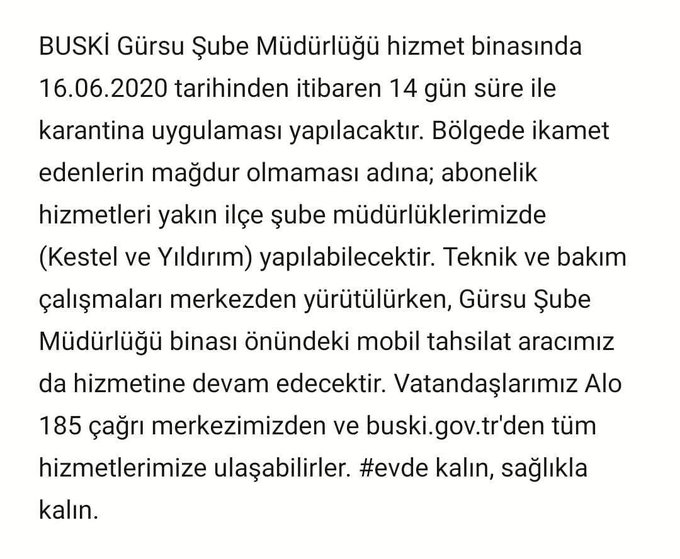 "BUSKİ Gürsu Şube Müdürlüğü hizmet binasında 16.06.2020 tarihinden itibaren 14 gün süre ile karantina uygulaması yapılacaktır. Bölgede ikamet edenlerin mağdur olmaması adına; abonelik hizmetleri yakın ilçe şube müdürlüklerimizde (Kestel ve Yıldırım) yapılabilecektir. Teknik ve bakım çalışmaları merkezden yürütülürken, Gürsu Şube Müdürlüğü binası önündeki mobil tahsilat aracımız da hizmetine devam edecektir. Vatandaşlarımız Alo 185 çağrı merkezimizden ve buski.gov.tr'den tüm hizmetlerimize ulaşabilirler. #evde kalın, sağlıkla kalın."