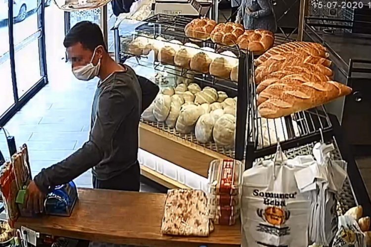 Kasiyerin başka biriyle ilgilendiği anda şüpheli, sadaka kutusunu alıp arkasına saklıyor. Cerrahi maskeli olduğu görülen şüpheli, bir süre bekledikten sonra fırından çıkıyor.