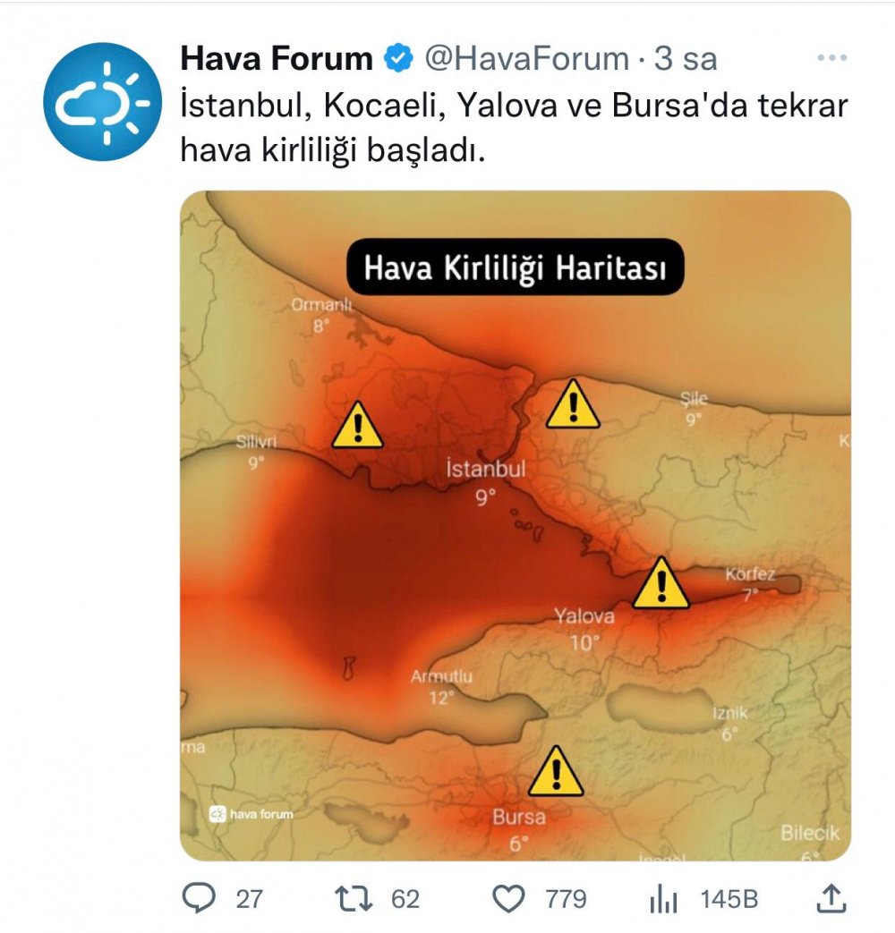 Hava Forum tarafından aktarılan bilgilere göre İstanbul, Kocaeli, Yalova ve Bursa'da hava kirliliği başladı.