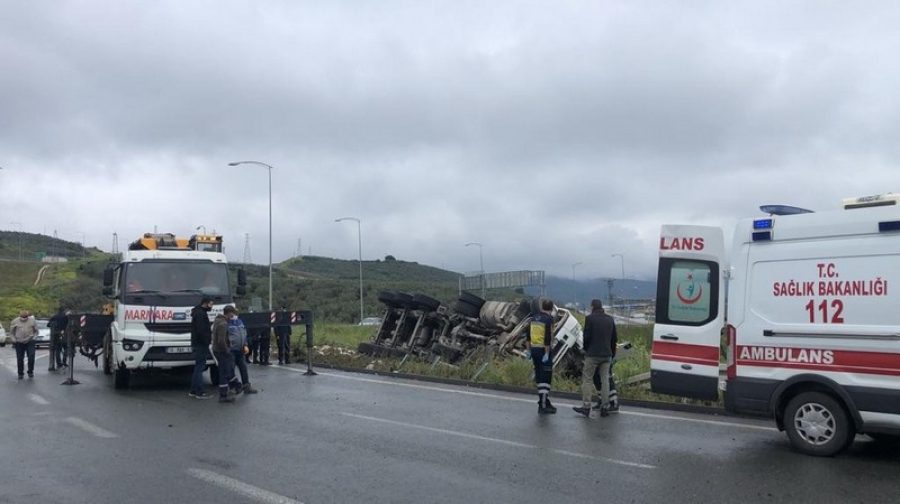 Gemlik'te otoyol çıkışında meydana gelen kazada mıcır yüklü kamyon devrildi. Kazada tır sürücüsü 59 yaşındaki Muhammed Adnan Yiğit araç içinde sıkışarak hayatını kaybetti. Vinç yardımı ile kamyon olay yerinde kaldırılırken, sürücünün Mustafa Kemal Paşa ilçesinden yüklediği mıcırı Gemlik'te bulunan taş ocağına getirdiği öğrenildi.