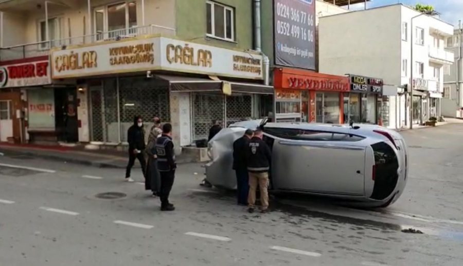 Erikli Caddesi üzerinde sürücünün kontrolünden çıkan araç yol kenarında bulunan çöp kovasına çarptı. Çarpmanın etkisiyle havalanan otomobil yan yattı.