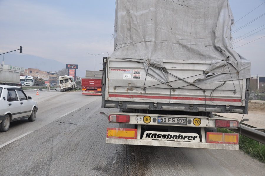 Edinilen bilgiye göre; Ankara'dan Bursa yönüne seyreden Yusuf Akkuş yönetimindeki 50 FS 991 çekici ve 50 FS 979 Dorse plakalı TIR, İnegöl ilçesinde kırmızı ışıkta bekleyen Kütahya'nın Domaniç ilçesinden İnegöl OSB'deki döküm fabrikasına işçi taşıyan Murat Dündar yönetimindeki 43 DB 284 plakalı servis minibüsüne arkadan çarptı.