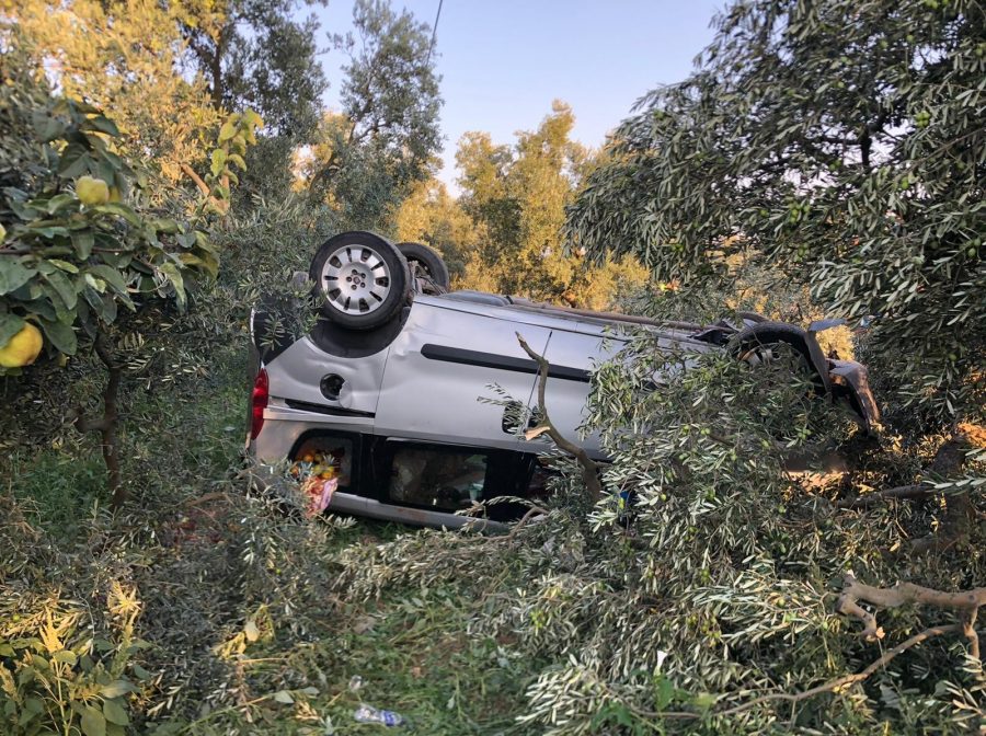 Takla atan ve zeytin ağaçlarına zarar veren araç ters döndü.