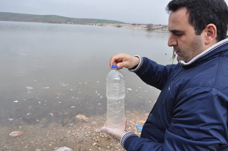 İhbar üzerine belirtilen yere gelen İnegöl İlçe Gıda Tarım ve Hayvancılık Müdürlüğü ekipleri, sudan ve balıklardan numune aldı.