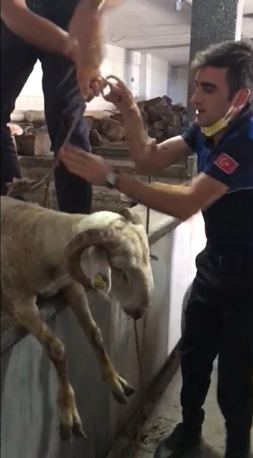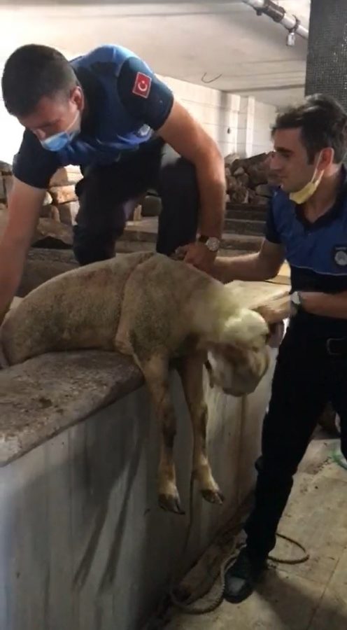 Bölgeye gelen zabıta ekibindeki bir personel, halatla kuyuya inerek kurbanlık koyunu çıkardı.