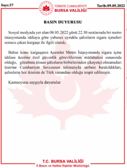BURSA VALİLİĞİ'NDEN AÇIKLAMA