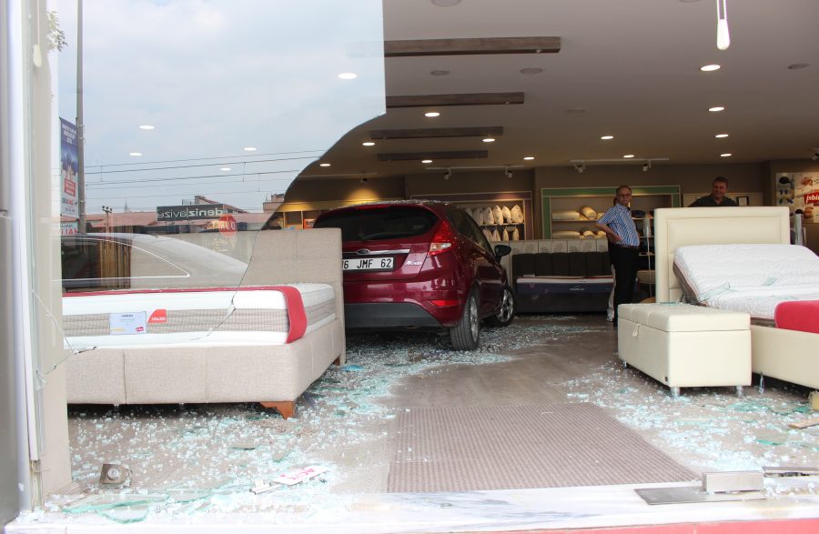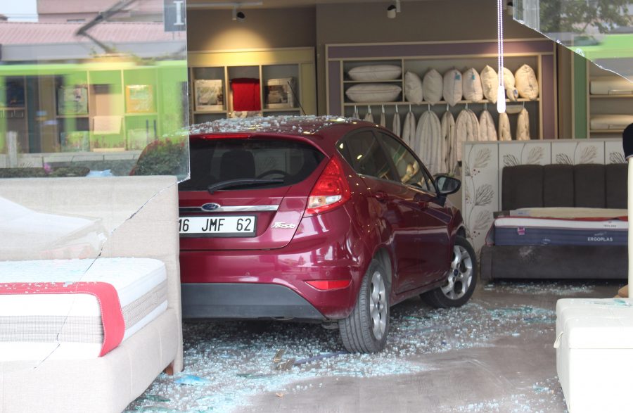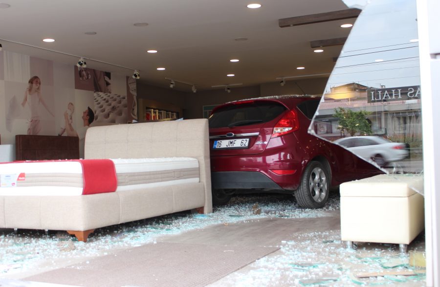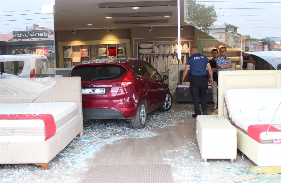 Kaza, merkez Nilüfer ilçesinde meydana geldi. Aracıyla ana yola çıkmak için dönen 16 JMF 62 plakalı aracın sürücüsü Nazım S, direksiyon hakimiyetini kaybederek yatak satışı yapan iş yerinin camını kırarak içeri girdi.