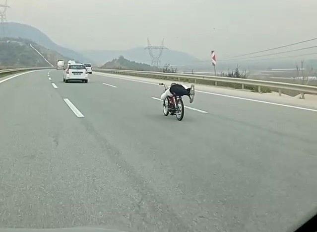 Edinilen bilgiye göre, kimliği bilinmeyen sürücü motosikletinin üzerine yatarak 130 kilometre hız yaptı. Sürücünün hiçbir güvenlik önlemi almaması şaşkınlığa neden olurken, maskesini takmayı ihmal etmeyen plakasız motosiklet sürücüsü, diğer araçtakiler tarafından cep telefonu kamerasıyla kaydedildi.