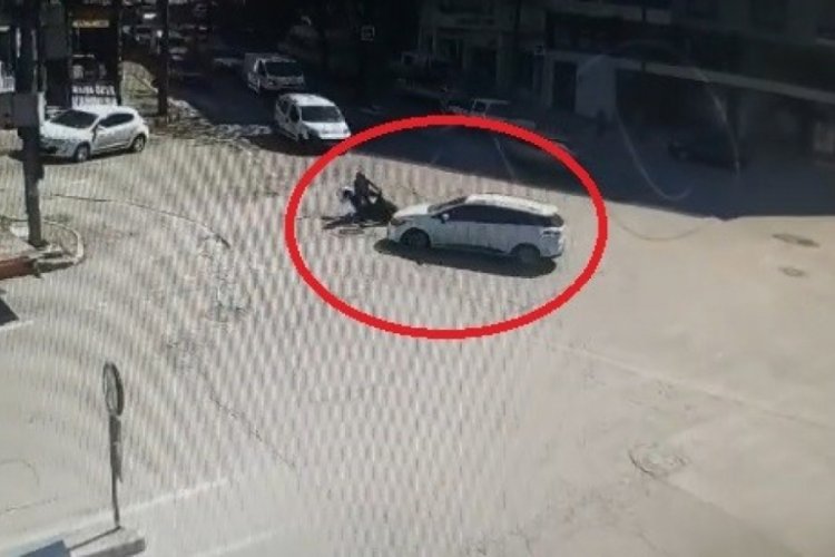 Kaza, merkez Osmangazi ilçesinde meydana geldi. Güvenlik kamerasına yansıyan görüntülerde cadde üzerinde seyir halindeki bir motosiklet sürücüsü karşı şeritten gelen otomobilin dönüş yaptığını son anda fark edince frene asıldı.