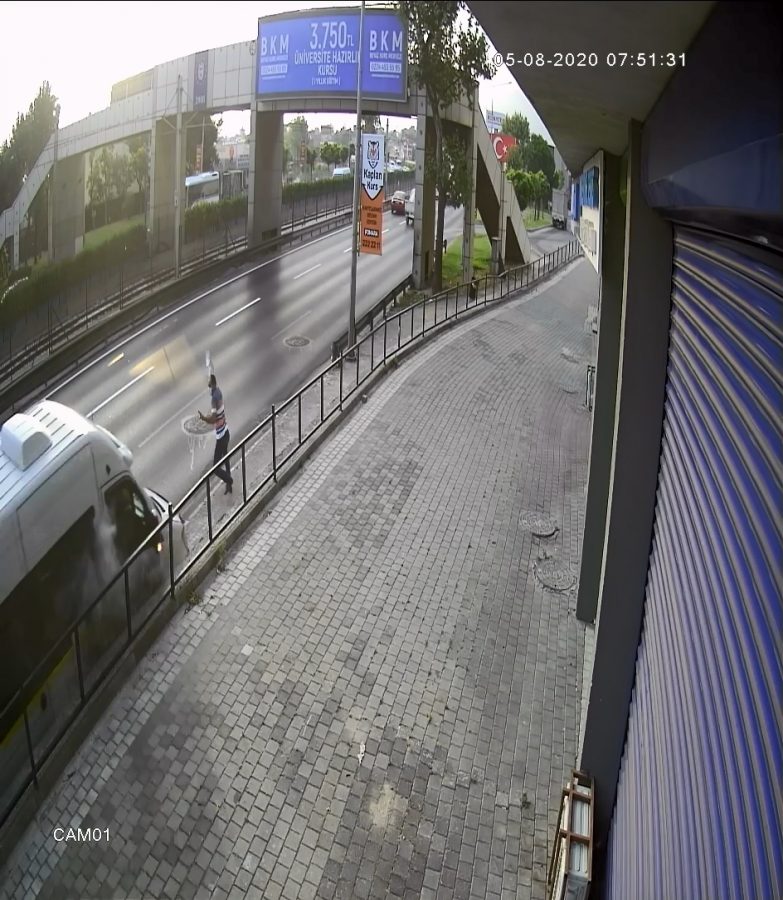 Kimliği öğrenilemeyen kişi, trafikte ilerleyen araçların arasında kalıp ölümden dönerken, minibüs kaldırıma çıkarak, tabela ile bariyere çarptı.
