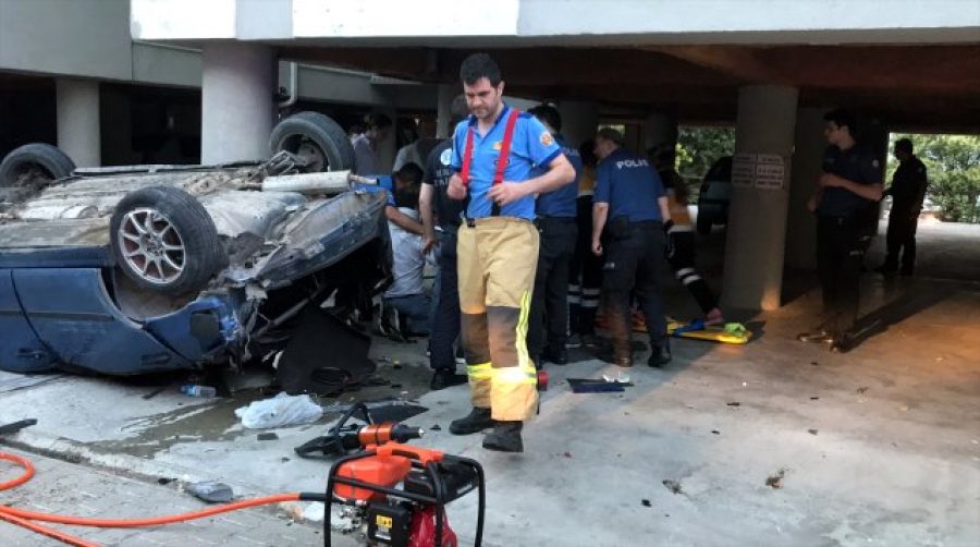 Devrilip apartmanın sütunlarından birine çarpan otomobildeki 3 kişi araçta sıkıştı. Sürücü Ünsal kendi imkanlarıyla araçtan çıkmayı başardı.