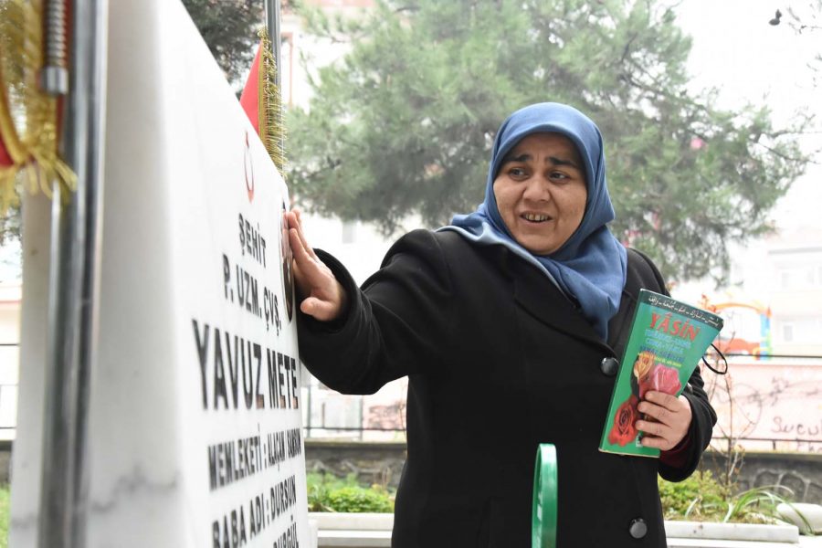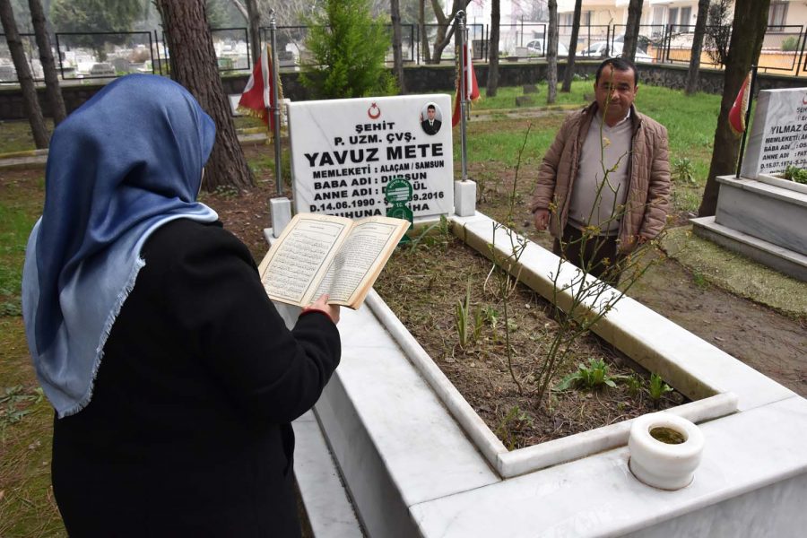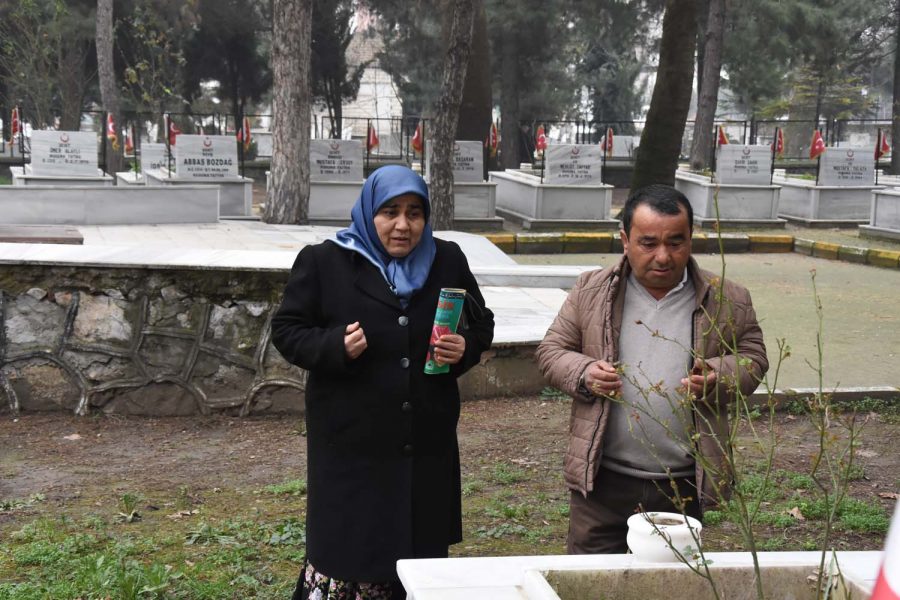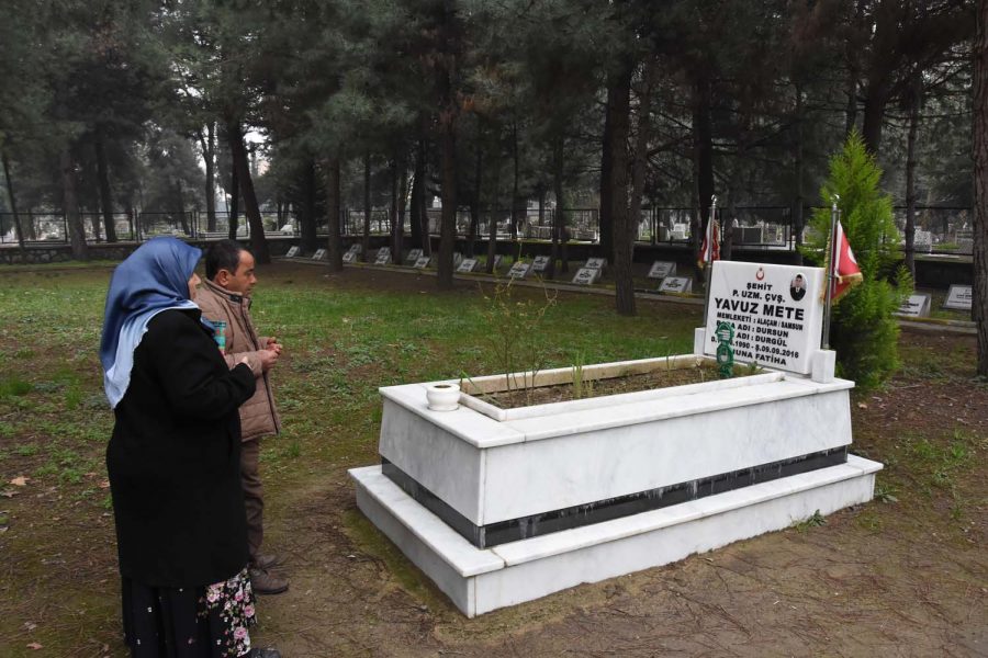 Aradan geçen 3 yıl boyunca her Cuma günü Garnizon Şehitliği'nde oğullarının kabrini ziyaret eden şehidin annesi Dugül ile babası Dursun Mete, oğulları için dua ediyor ve mezarına su döküyor.