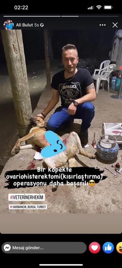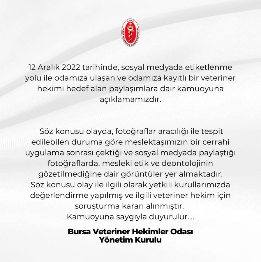 Harmancık İlçesi'nde veteriner hekimlik yapan Ali Bulut isimli şahıs sosyal medyada infiale neden olan olayda, kısırlaştırma işlemi uyguladığı hayvanların fotoğraflarını mesleki etiğe uygunsuz şekilde paylaştı. Duruma tepki gösteren sosyal medya kullanıcıları, Ali Bulut isimli şahıs hakkında Bursa Veteriner Hekimler Odası'nı etiketleyerek yaptırım istedi. Duruma kayıtsız kalmayan Bursa Barosu ve BVHO, şahıs hakkında mesleki etik ve deontolojinin gözetilmediği gerekçesiyle soruşturma başlattı.