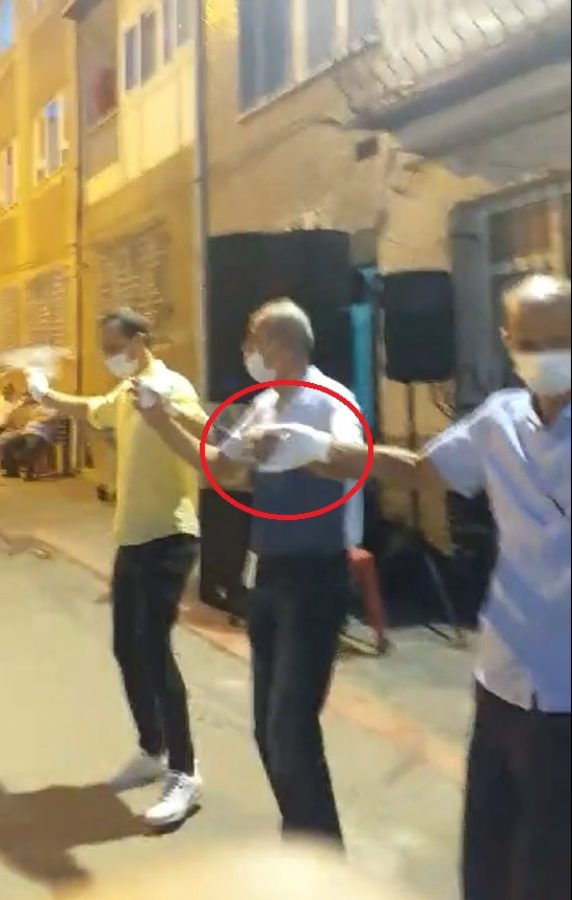 Sosyal medyaya da yansıyan diğer bir eğlence etkinliğinde ise, yaklaşık 30 kişilik bir grup ellerine eldiven geçirerek halay çekti. Maske kuralına uyduğu gözlenen grup ile birlikte bazı davetlilerin sosyal mesafe gözetmeksizin yan yana oturlduğu dikkat çekti.