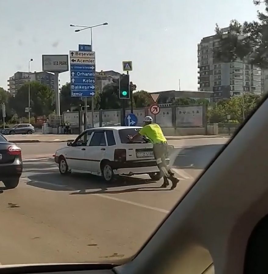Bursa'da trafik polisi yolda kalan otomobili iterek, sürücüye yardım etti
