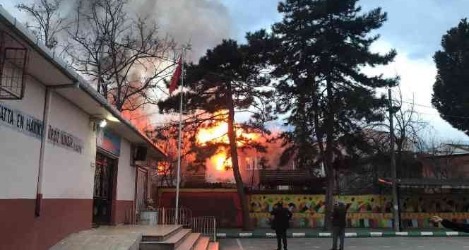 Bursa'da bir ilköğretim okulunun etrafındaki 3 ahşap ev alev alev yanınca okulun bir bloğu tahliye edildi. Yangına müdahale eden itfaiye ekipleri, çöken çatının altında kalmaktan son anda kurtuldu. Okul bahçesine çıkarılan çocuklar yangını korku dolu gözlerle izledi.