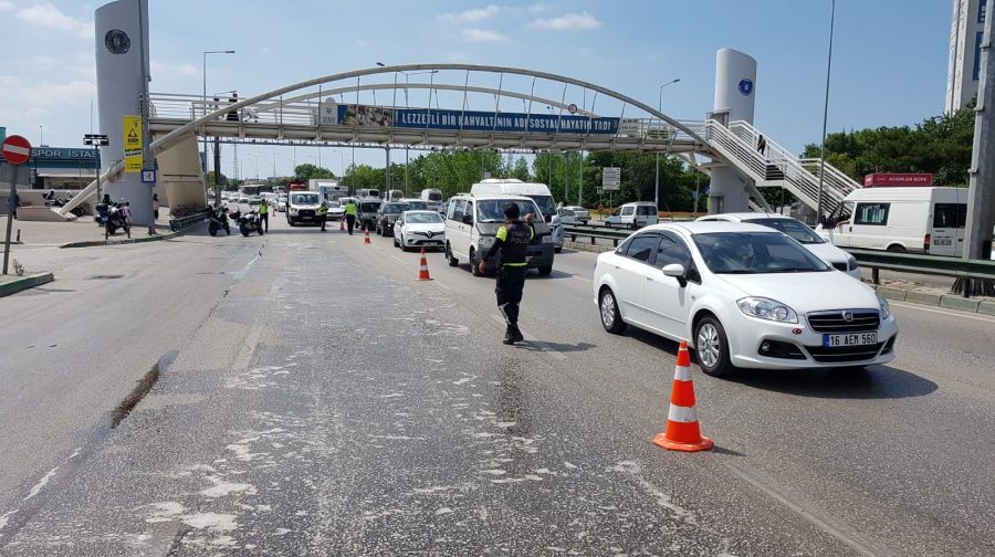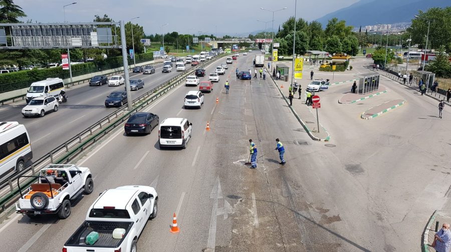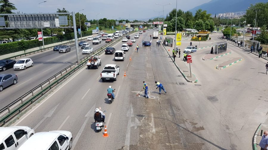 Bursa Büyükşehir Belediye ekipleri, kısa sürede olay yerine gelerek yağla kaplı yolu temizlemeye başladı.