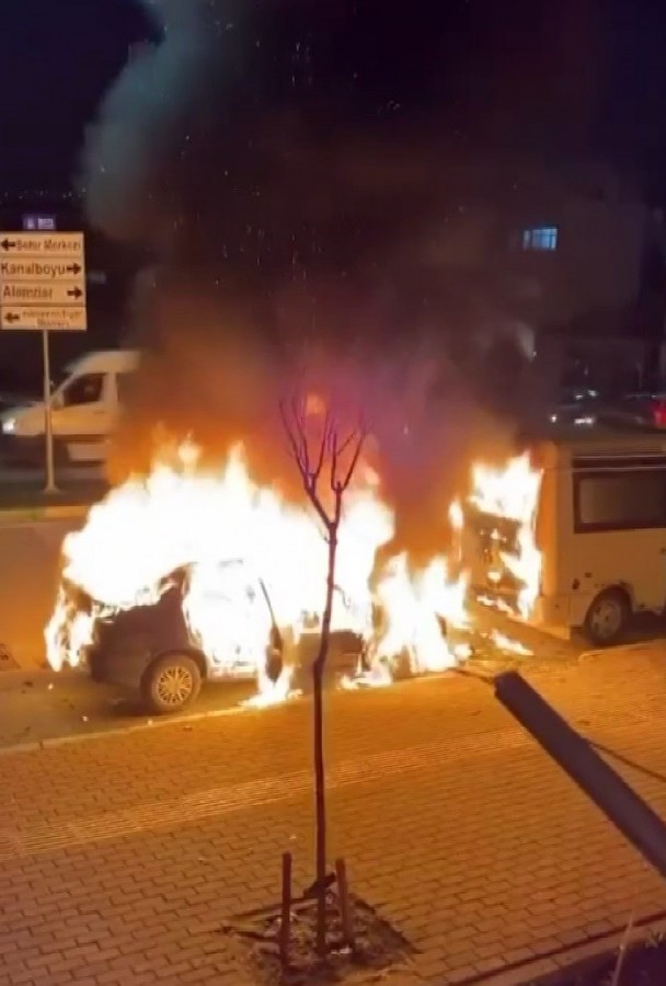 İki aracın alev alev yanma anı ise cep telefonu kamerasına yansıdı.