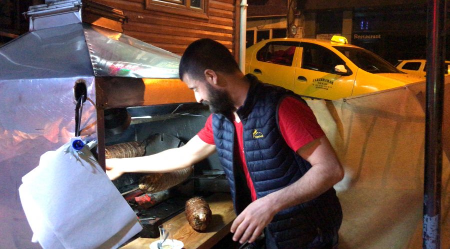 Sokağa çıkma kısıtlamasına rağmen dışarı çıkan 2 şüpheli, kokoreç dükkanının önüne geldi. Kokoreççinin önüne gelen 2 hırsız, bir süre etrafına bakarak caddeyi kontrol etti.