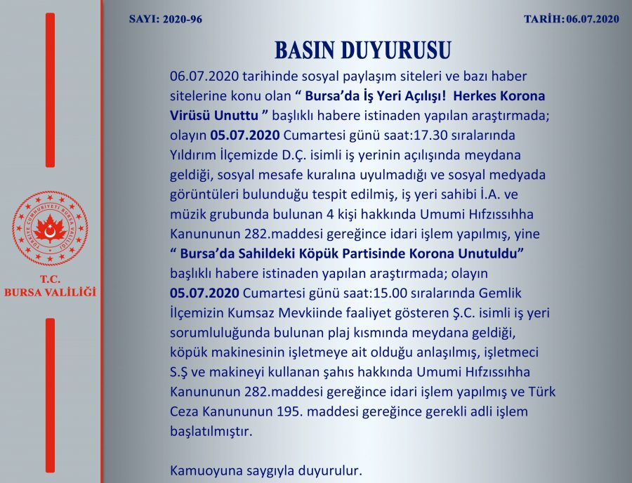 "06.07.2020 tarihinde sosyal paylaşım siteleri ve bazı haber sitelerine konu olan "Bursa'da İş Yeri Açılışı! Herkes Korona Virüsü Unuttu" başlıklı habere istinaden yapılan araştırmada; olayın 05.07.2020 Cumartesi günü saat:17.30 sıralarında Yıldırım İlçemizde D.Ç. isimli iş yerinin açılışında meydana geldiği, sosyal mesafe kuralına uyulmadığı ve sosyal medyada görüntüleri bulunduğu tespit edilmiş, iş yeri sahibi İ.A. ve müzik grubunda bulunan 4 kişi hakkında Umumi Hıfzıssıhha Kanununun 282.maddesi gereğince idari işlem yapılmış, yine "Bursa'da Sahildeki Köpük Partisinde Korona Unutuldu" başlıklı habere istinaden yapılan araştırmada; olayın 05.07.2020 Cumartesi günü saat:15.00 sıralarında Gemlik ilçemizin Kumsaz Mevkiinde faaliyet gösteren Ş.C. isimli iş yeri sorumluluğunda bulunan plaj kısmında meydana geldiği, köpük makinesinin işletmeye ait olduğu anlaşılmış, işletmeci S.Ş ve makineyi kullanan şahıs hakkında Umumi Hıfzıssıhha Kanununun 282.maddesi gereğince idari işlem yapılmış ve Türk Ceza Kanununun 195. maddesi gereğince gerekli adli işlem başlatılmıştır." denildi.