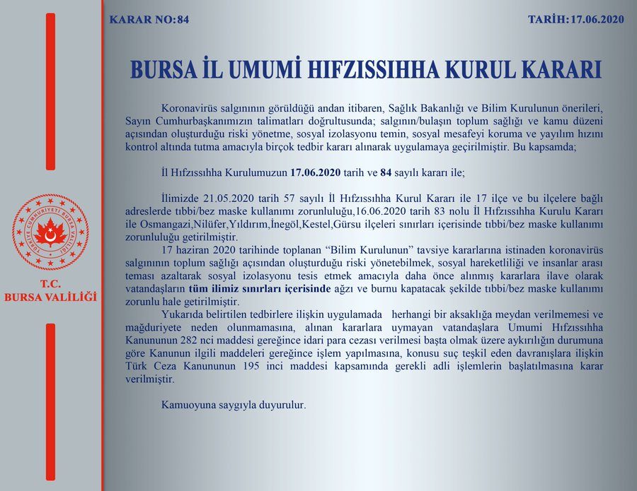İlimizde 21.05.2020 tarih 57 sayılı İl Hıfzıssıhha Kurul Kararı ile 17 ilçe ve bu ilçelere bağlı adreslerde tıbbi/bez maske kullanımı zorunluluğu, 16.06.2020 tarih 83 nolu il Hıfzıssıhha Kurulu Kararı ile Osmangazi,Nilüfer, Yıldırım, İnegöl, Kestel, Gürsu ilçeleri sınırları içerisinde tıbbi/bez maske kullanımı zorunluluğu getirilmiştir.