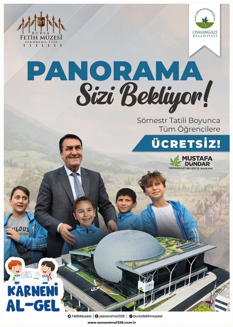 Osmangazi Belediyesi, Bursa’nın fetih gününün sanal olarak canlandırıldığı Panorama 1326 Bursa Fetih Müzesi’nde öğrencileri tarihi bir yolculuğa çıkarıyor. Sömestr tatili boyunca karnelerini getirip müzeyi ücretsiz olarak ziyaret etme fırsatı bulabilecek öğrenciler, aynı zamanda düzenlenecek çeşitli etkinliklerle keyifli anlar yaşayacak.