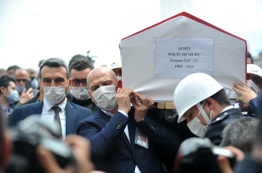 Törenin ardından şehidin Türk bayrağına sarılı tabutuna bir süre omuz veren Bakan Soylu, daha sonra Özcan'ın eşine taziyede bulundu.