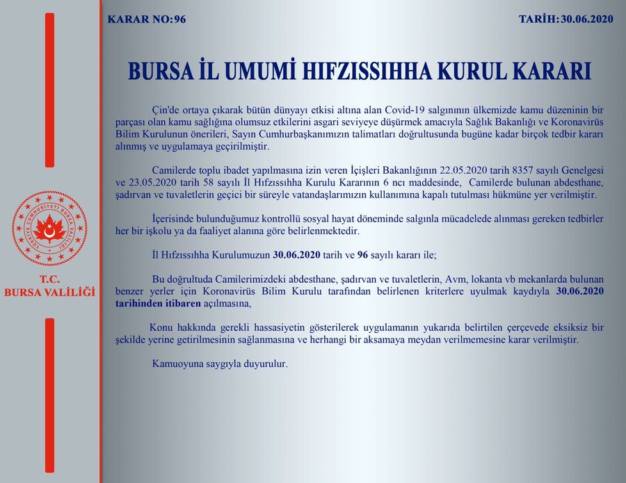 Bu doğrultuda Camilerimizdeki abdesthane, şadırvan ve tuvaletlerin, Avm, lokanta vb mekanlarda bulunan benzer yerler için Koronavirüs Bilim Kurulu tarafından belirlenen kriterlere uyulmak kaydıyla 30.06.2020 tarihinden itibaren açılmasına,